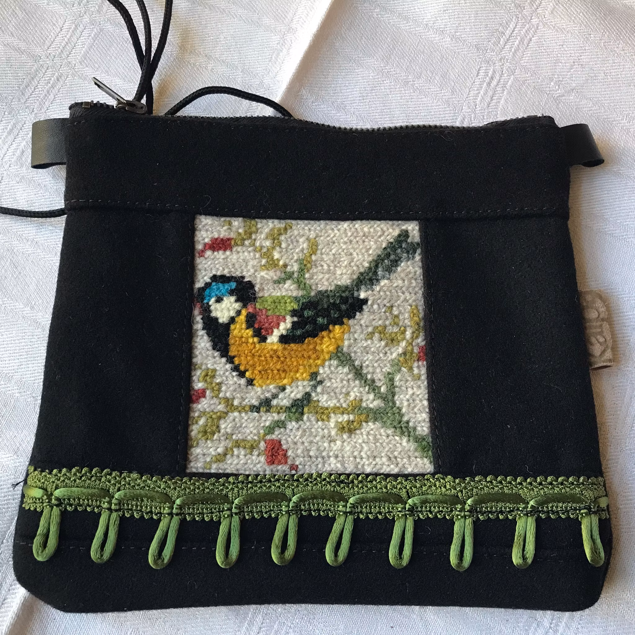 Liten väska i svart vadmal med återbrukat handbroderi Lång reglerbar axelrem 115 cm Blixtlås. Fint bomullsfoder. Kantade sömmar inuti. Mått ca 22 x 20 cm