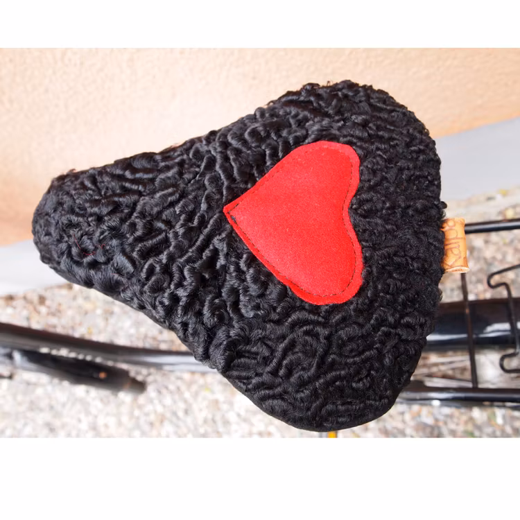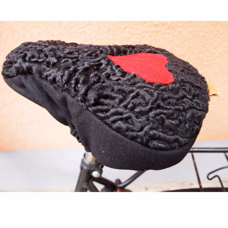 Cykelsadelskydd i återbrukad persian. Fodrad med vadmal och sidor i vadmal.