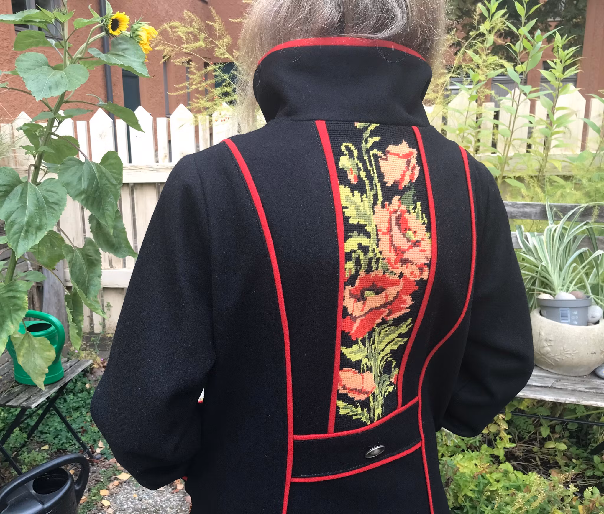 Stort handbroderi i rygg bak.