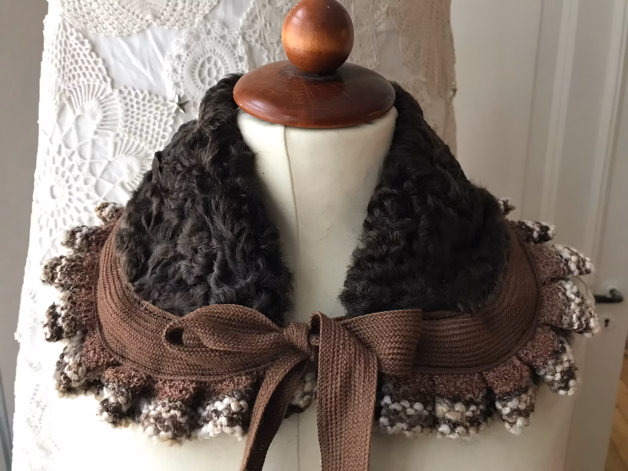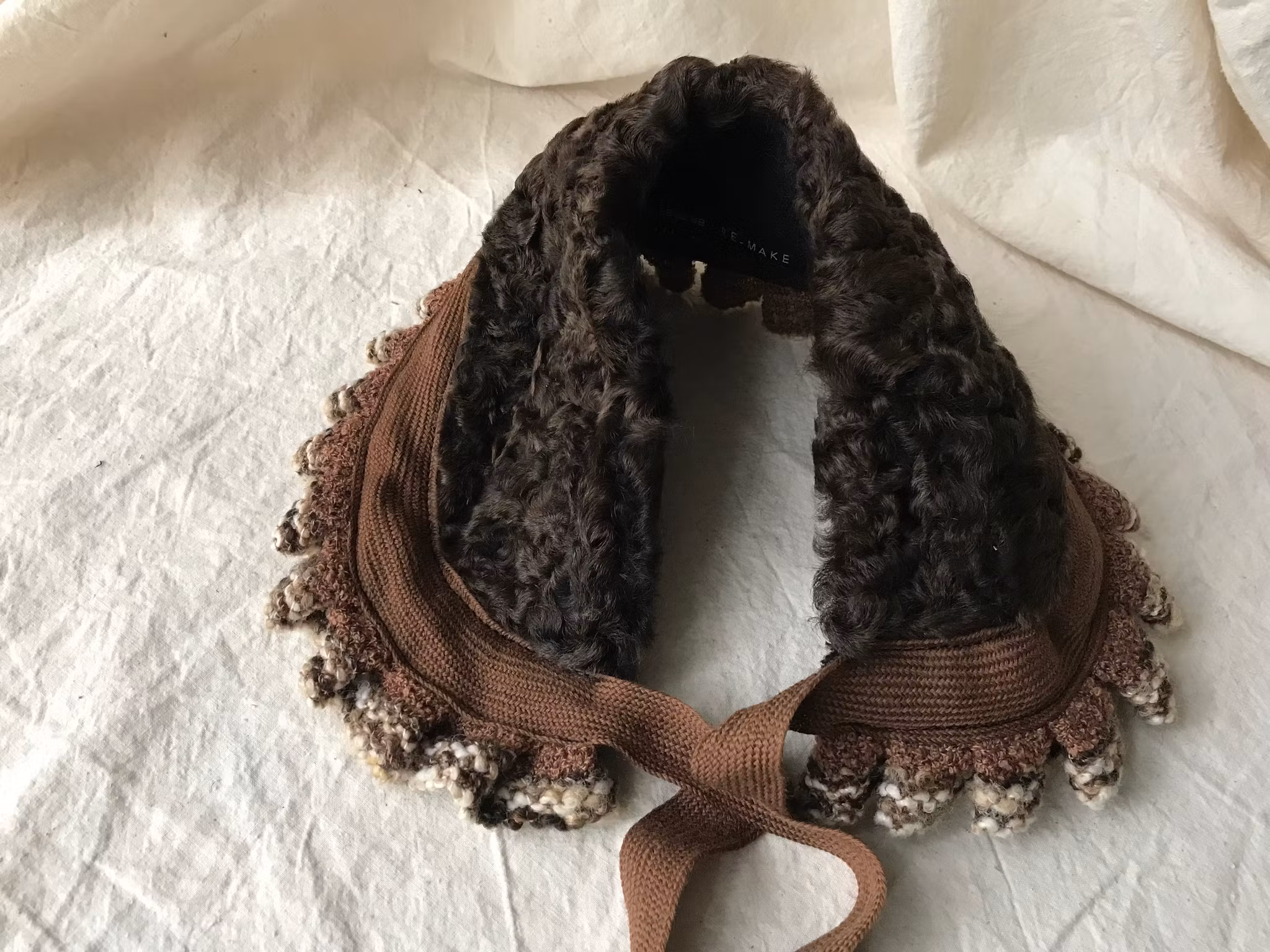 Pälsen är återbrukad, brun persian. Fodrad med kokt ull.