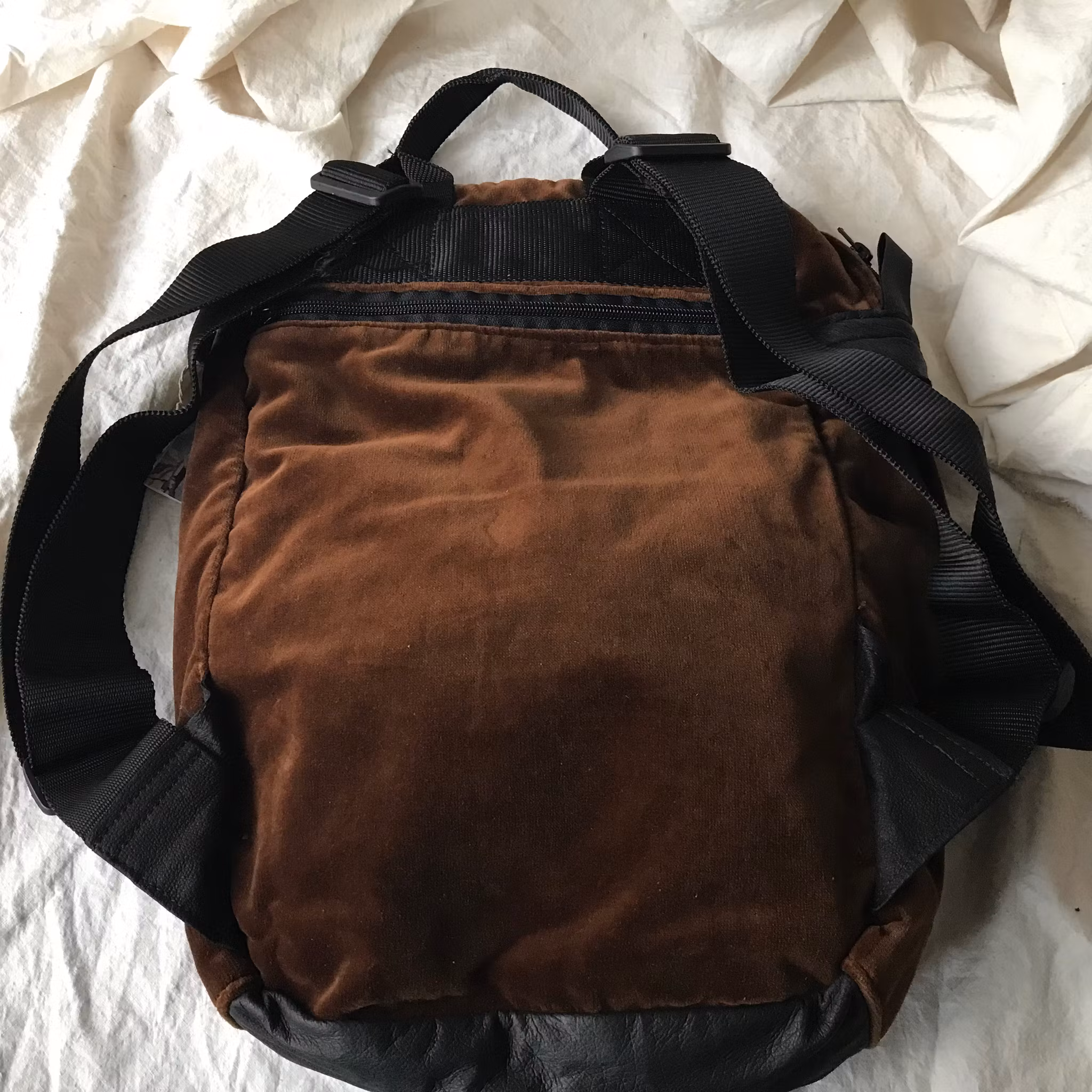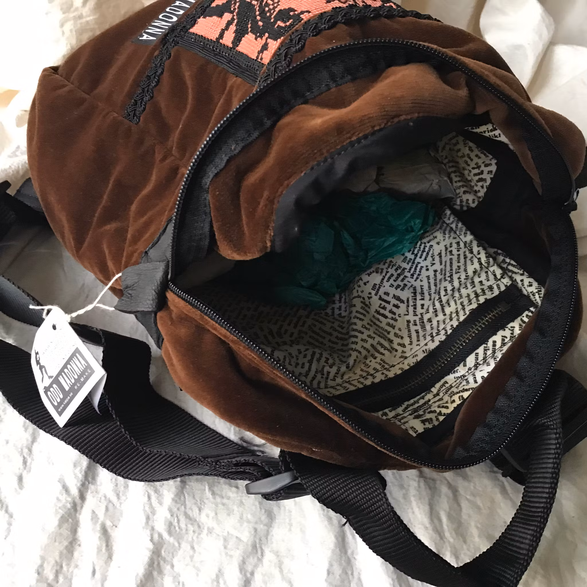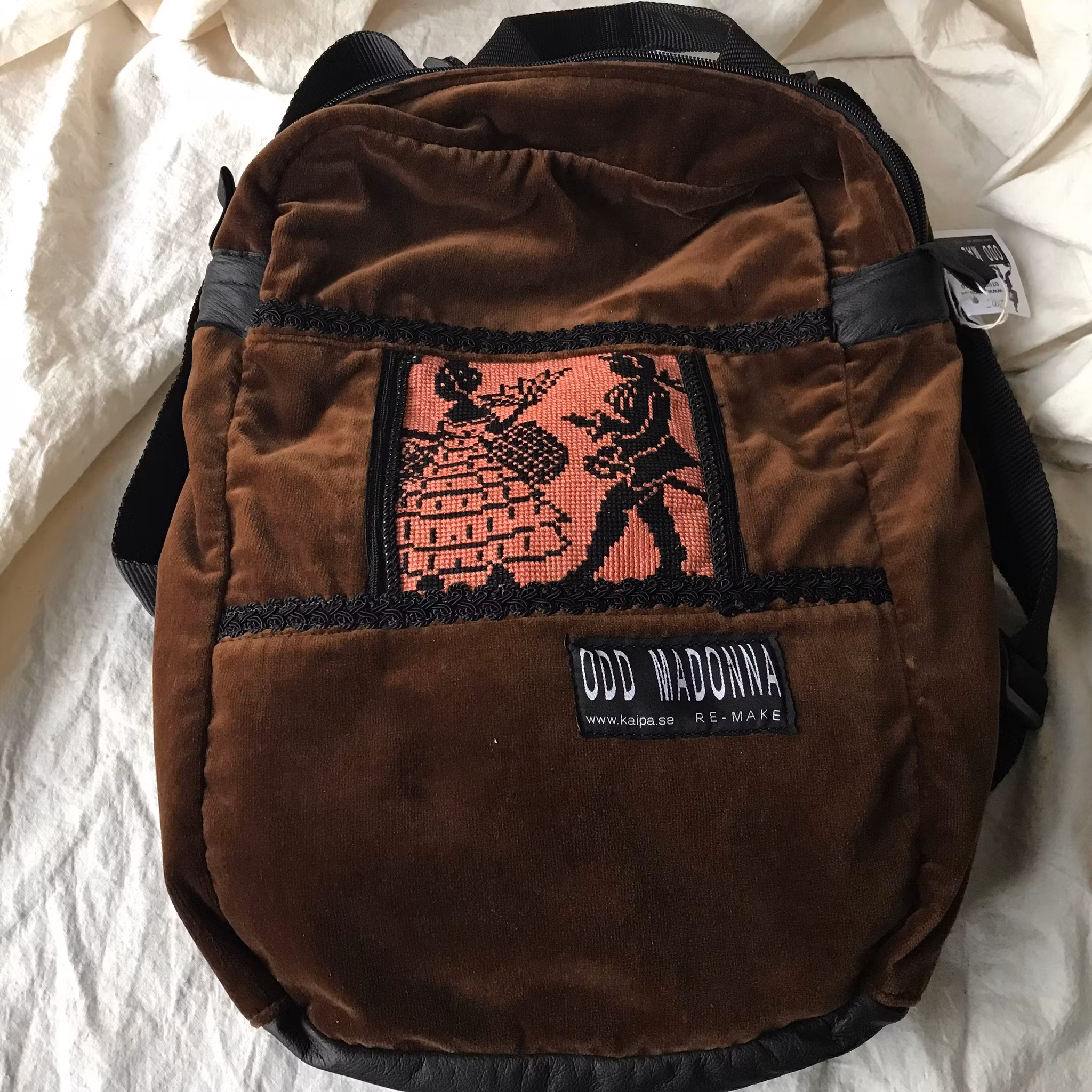 Vacker och praktisk ryggsäck i sammet med återbrukat, unikt handbroderi.Kraftigt, ljust bomullsfoder som gör att du ser vad som finns inuti.Bandkantade sömmar.
